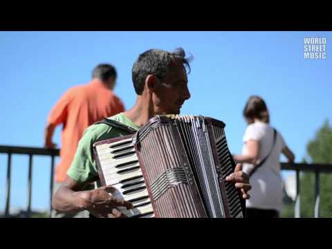 Busking accordion player from Romania is playing improvisation with fragments of Monti Chardash and Libertango/Astor Piazzolla in the street near Notr...